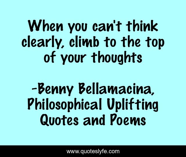 This page presents the quote "When you can't think clearly, climb to the top of your thoughts". Author of this quote is Benny Bellamacina, Philosophical Uplifting Quotes and Poems. This quote is about thought, philosophical, mind, wisdom,.