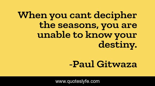 This page presents the quote "When you cant decipher the seasons, you are unable to know your destiny.". Author of this quote is Paul Gitwaza. This quote is about destiny, christianity, pastors, inspirational, churches, seasons, enthusiasm,.