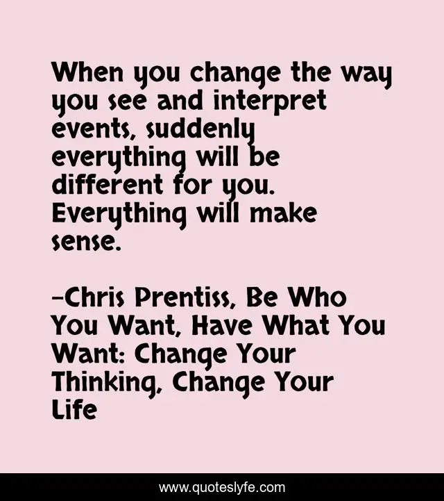 This page presents the quote "When you change the way you see and interpret events, suddenly everything will be different for you. Everything will make sense.". Author of this quote is Chris Prentiss, Be Who You Want, Have What You Want: Change Your Thinking, Change Your Life. This quote is about life, philosophy, chris-prentiss, passages-ventura, perspective, inspirational, passages-malibu, enthusiasm, change,.