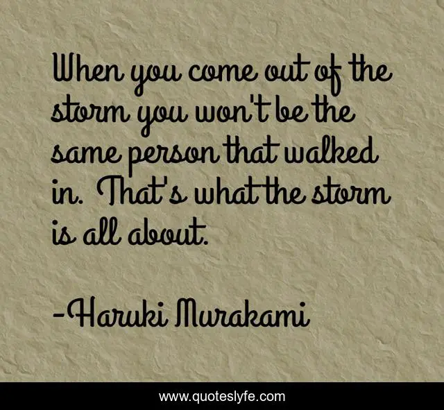 This page presents the quote "When you come out of the storm you won't be the same person that walked in. That's what the storm is all about.". Author of this quote is Haruki Murakami. This quote is about life, purpose, sad,.