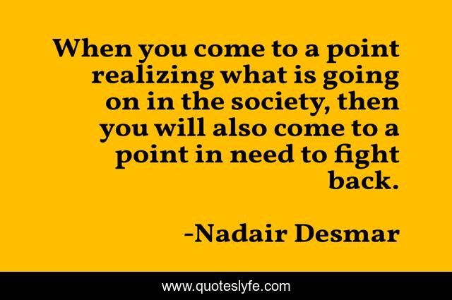 This page presents the quote "When you come to a point realizing what is going on in the society, then you will also come to a point in need to fight back.". Author of this quote is Nadair Desmar. This quote is about society, point,.