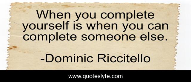 This page presents the quote "When you complete yourself is when you can complete someone else.". Author of this quote is Dominic Riccitello. This quote is about self-love, love, complete, finding-yourself, quote, completing-yourself, thoughts, others, opinion,.