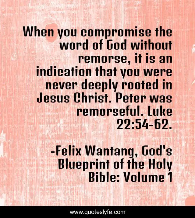This page presents the quote "When you compromise the word of God without remorse, it is an indication that you were never deeply rooted in Jesus Christ. Peter was remorseful. Luke 22:54-62.". Author of this quote is Felix Wantang, God's Blueprint of the Holy Bible: Volume 1. This quote is about jesus-christ, god, heaven, compromise, peter,.