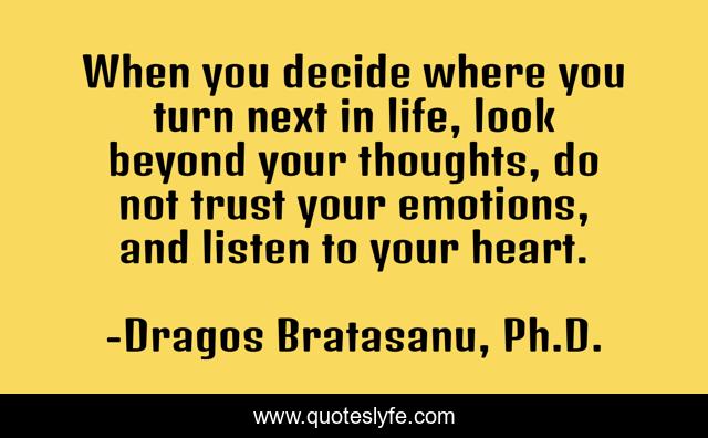 This page presents the quote "When you decide where you turn next in life, look beyond your thoughts, do not trust your emotions, and listen to your heart.". Author of this quote is Dragos Bratasanu, Ph.D.. This quote is about life, follow-your-heart, listen-to-your-heart, emotions, follow-your-dreams, thoughts, love, decisions, affection,.