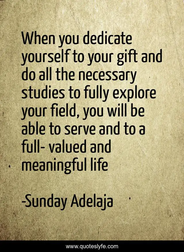 This page presents the quote "When you dedicate yourself to your gift and do all the necessary studies to fully explore your field, you will be able to serve and to a full- valued and meaningful life". Author of this quote is Sunday Adelaja. This quote is about life, gift, dedicate, calling, field, explore, purpose, dedication,.