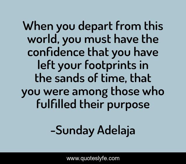 This page presents the quote "When you depart from this world, you must have the confidence that you have left your footprints in the sands of time, that you were among those who fulfilled their purpose". Author of this quote is Sunday Adelaja. This quote is about confidence, depart, calling, sand, purpose, time, footprint, world, fulfill,.