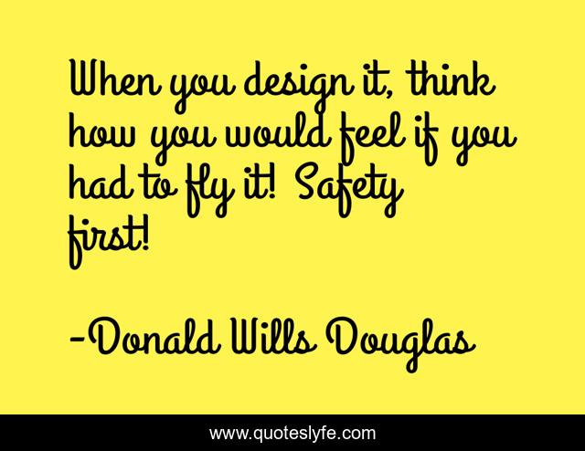 This page presents the quote "When you design it, think how you would feel if you had to fly it! Safety first!". Author of this quote is Donald Wills Douglas. This quote is about fly, safety, think,.