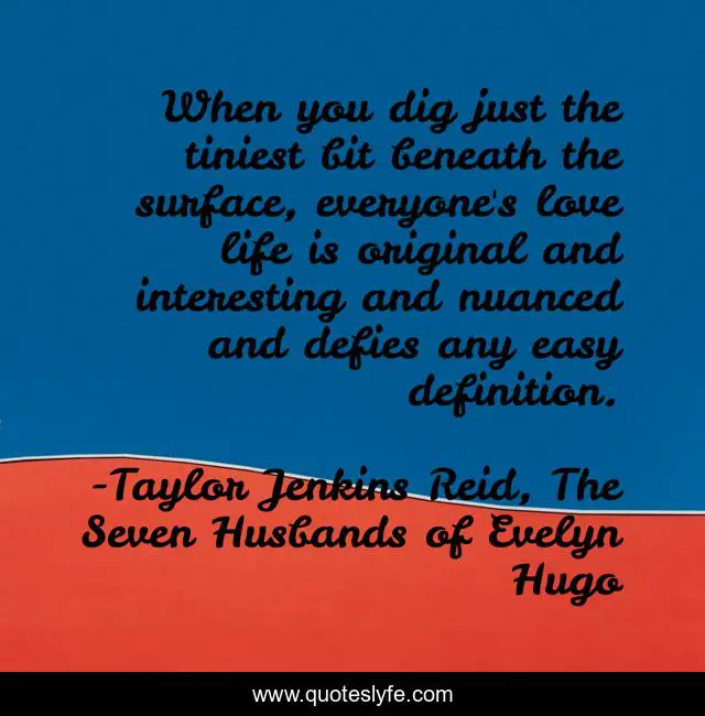 This page presents the quote "When you dig just the tiniest bit beneath the surface, everyone's love life is original and interesting and nuanced and defies any easy definition.". Author of this quote is Taylor Jenkins Reid, The Seven Husbands of Evelyn Hugo. .