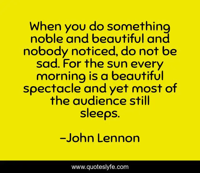 This page presents the quote "When you do something noble and beautiful and nobody noticed, do not be sad. For the sun every morning is a beautiful spectacle and yet most of the audience still sleeps.". Author of this quote is John Lennon. This quote is about life, beatles, sadness, beauty, nature,.