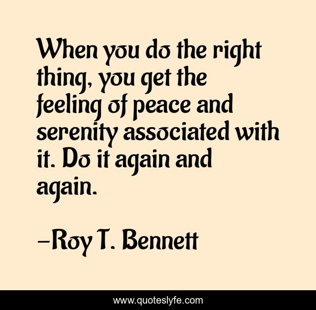 This page presents the quote "When you do the right thing, you get the feeling of peace and serenity associated with it. Do it again and again.". Author of this quote is Roy T. Bennett. This quote is about living, inspiring, inspire, inspiration, do-the-right-thing, positive-affirmation, peace, life, confidence,.