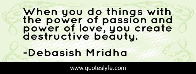 This page presents the quote "When you do things with the power of passion and power of love, you create destructive beauty.". Author of this quote is Debasish Mridha. This quote is about life, love, knowledge, inspirational, intelligence, philosophy, wisdom, quotes, affection,.