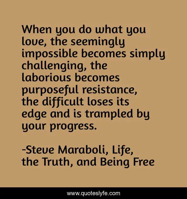 This page presents the quote "When you do what you love, the seemingly impossible becomes simply challenging, the laborious becomes purposeful resistance, the difficult loses its edge and is trampled by your progress.". Author of this quote is Steve Maraboli, Life, the Truth, and Being Free. This quote is about life, love, purposeful, motivational, confidence, challenges, optimistic, positive, action,.