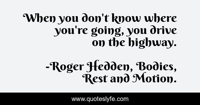 This page presents the quote "When you don't know where you're going, you drive on the highway.". Author of this quote is Roger Hedden, Bodies, Rest and Motion.. This quote is about drama, hope, modern-life,.