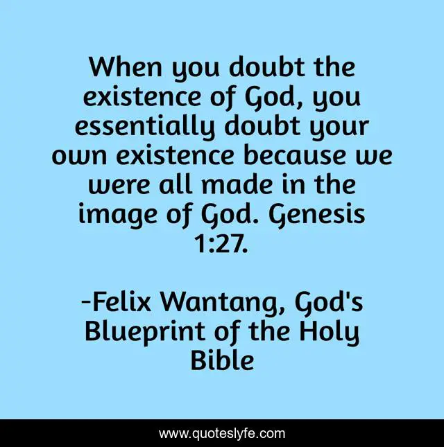 This page presents the quote "When you doubt the existence of God, you essentially doubt your own existence because we were all made in the image of God. Genesis 1:27.". Author of this quote is Felix Wantang, God's Blueprint of the Holy Bible. This quote is about existence, image, doubt, god, made,.