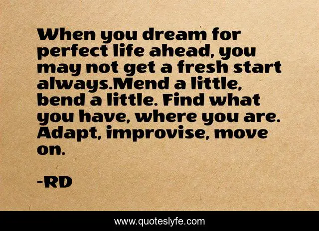 This page presents the quote "When you dream for perfect life ahead, you may not get a fresh start always.Mend a little, bend a little. Find what you have, where you are. Adapt, improvise, move on.". Author of this quote is RD. This quote is about life, dream, adapt,.