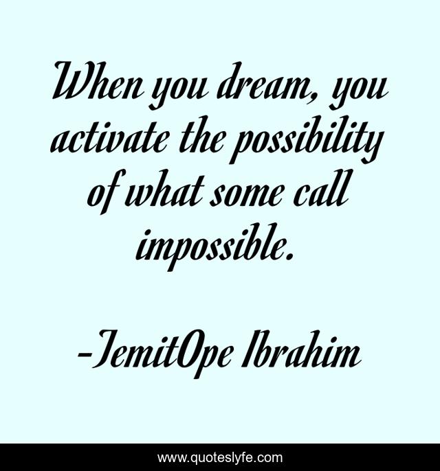 This page presents the quote "When you dream, you activate the possibility of what some call impossible.". Author of this quote is TemitOpe Ibrahim. This quote is about confidence, impossibilities, positive, motivational, truths, possible, possibilities, optimistic, inspirational,.