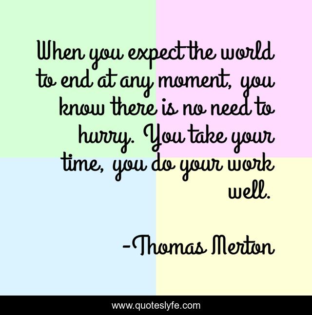 This page presents the quote "When you expect the world to end at any moment, you know there is no need to hurry. You take your time, you do your work well.". Author of this quote is Thomas Merton. This quote is about work, apocalypse,.