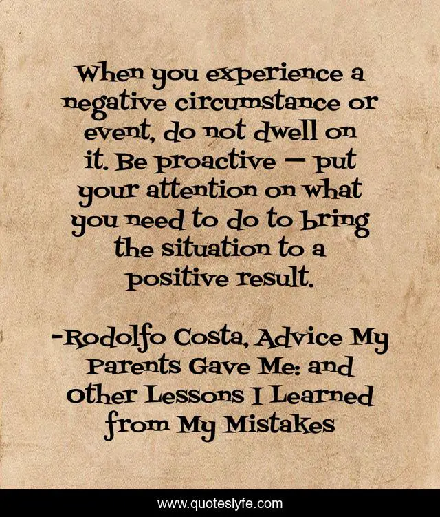 This page presents the quote "When you experience a negative circumstance or event, do not dwell on it. Be proactive — put your attention on what you need to do to bring the situation to a positive result.". Author of this quote is Rodolfo Costa, Advice My Parents Gave Me: and Other Lessons I Learned from My Mistakes. This quote is about motivation, success, attention, behaviour, attitude, determination, goals,.