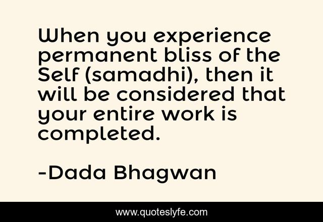 This page presents the quote "When you experience permanent bliss of the Self (samadhi), then it will be considered that your entire work is completed.". Author of this quote is Dada Bhagwan. This quote is about spiritual, self, soul, experience, bliss, atma, happiness,.