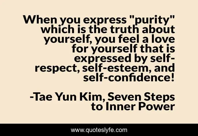 This page presents the quote "When you express "purity" which is the truth about yourself, you feel a love for yourself that is expressed by self-respect, self-esteem, and self-confidence!". Author of this quote is Tae Yun Kim, Seven Steps to Inner Power. This quote is about self-respect, love, self-confidence, purity, inspirational, enthusiasm, affection, self-esteem,.