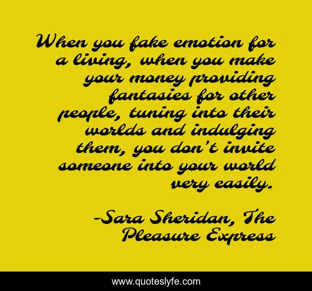 This page presents the quote "When you fake emotion for a living, when you make your money providing fantasies for other people, tuning into their worlds and indulging them, you don’t invite someone into your world very easily.". Author of this quote is Sara Sheridan, The Pleasure Express. This quote is about emotion, privacy, prostitution, reality, fantasy, fake,.