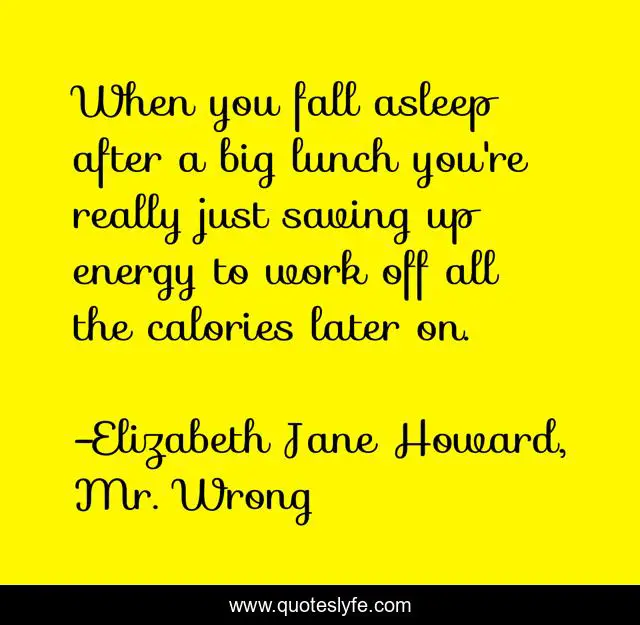This page presents the quote "When you fall asleep after a big lunch you're really just saving up energy to work off all the calories later on.". Author of this quote is Elizabeth Jane Howard, Mr. Wrong. This quote is about exercises, dieting, humorous,.