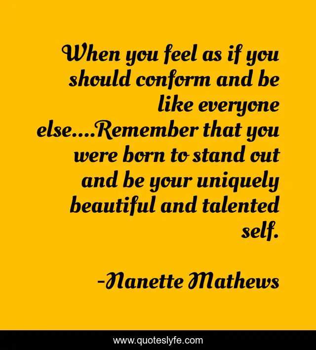 This page presents the quote "When you feel as if you should conform and be like everyone else....Remember that you were born to stand out and be your uniquely beautiful and talented self.". Author of this quote is Nanette Mathews. This quote is about self-love, be-you, unapologetically-you, be-yourself, stand-out, self-worth, uniqueness, inspirational, enthusiasm,.