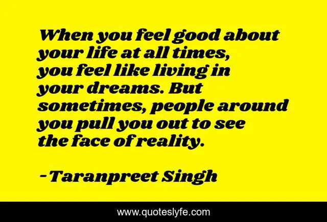 This page presents the quote "When you feel good about your life at all times, you feel like living in your dreams. But sometimes, people around you pull you out to see the face of reality.". Author of this quote is Taranpreet Singh. This quote is about life, power-of-thoughts, life-lessons, truly-living, dreams-and-reality, dreams,.
