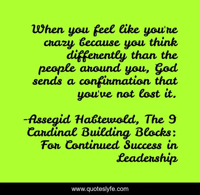 This page presents the quote "When you feel like you're crazy because you think differently than the people around you, God sends a confirmation that you've not lost it.". Author of this quote is Assegid Habtewold, The 9 Cardinal Building Blocks: For Continued Success in Leadership. This quote is about god, crazy, lost-it, confirmation, think-different,.