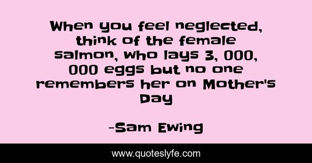 This page presents the quote "When you feel neglected, think of the female salmon, who lays 3, 000, 000 eggs but no one remembers her on Mother's Day". Author of this quote is Sam Ewing. This quote is about humor, mother,.