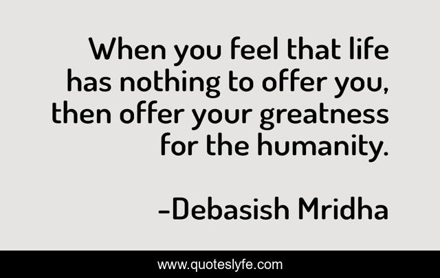This page presents the quote "When you feel that life has nothing to offer you, then offer your greatness for the humanity.". Author of this quote is Debasish Mridha. This quote is about life, debasish, mridha, philosophy, greatness, humanity,.