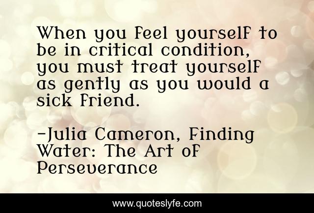 This page presents the quote "When you feel yourself to be in critical condition, you must treat yourself as gently as you would a sick friend.". Author of this quote is Julia Cameron, Finding Water: The Art of Perseverance. .
