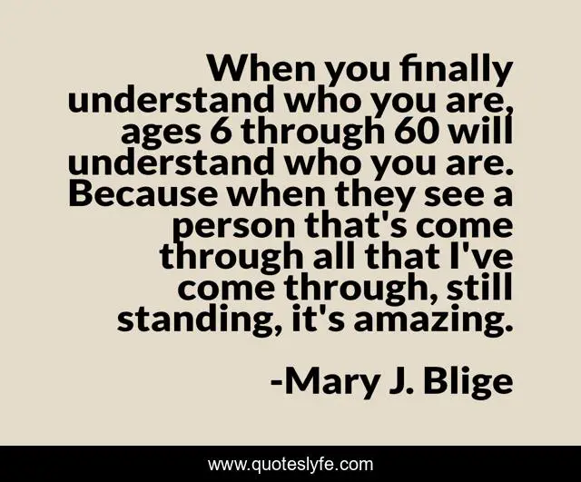This page presents the quote "When you finally understand who you are, ages 6 through 60 will understand who you are. Because when they see a person that's come through all that I've come through, still standing, it's amazing.". Author of this quote is Mary J. Blige. This quote is about person, see,.