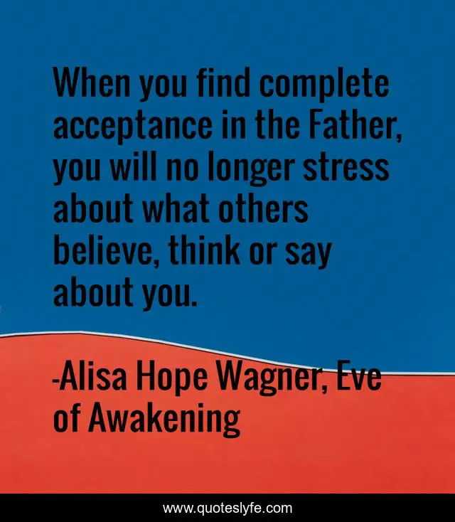 This page presents the quote "When you find complete acceptance in the Father, you will no longer stress about what others believe, think or say about you.". Author of this quote is Alisa Hope Wagner, Eve of Awakening. This quote is about god, stress, acceptance,.