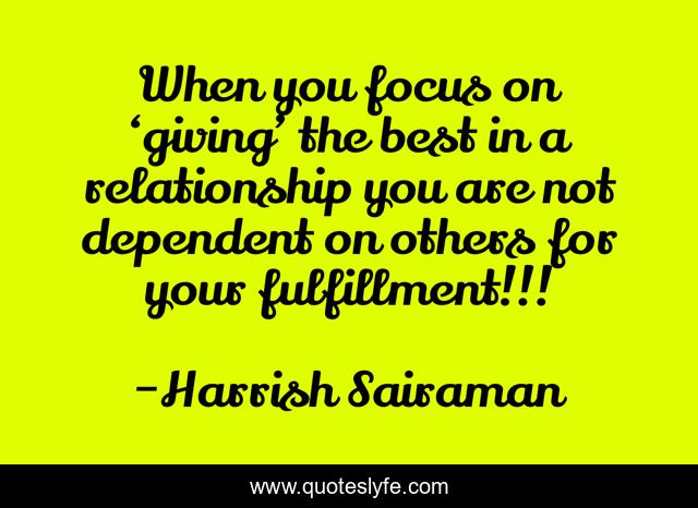This page presents the quote "When you focus on ‘giving’ the best in a relationship you are not dependent on others for your fulfillment!!!". Author of this quote is Harrish Sairaman. This quote is about independent, relationship, dependent, giving, fulfillment, best,.
