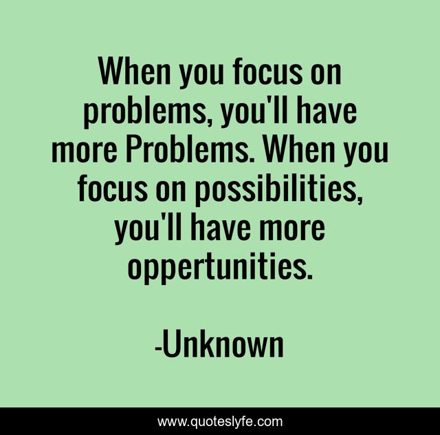 This page presents the quote "When you focus on problems, you'll have more Problems. When you focus on possibilities, you'll have more oppertunities.". Author of this quote is Unknown. This quote is about oppertunity, problems, positivity, problems-in-life,.