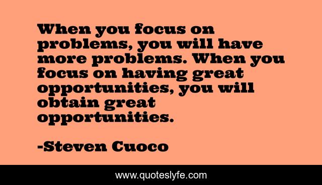This page presents the quote "When you focus on problems, you will have more problems. When you focus on having great opportunities, you will obtain great opportunities.". Author of this quote is Steven Cuoco. This quote is about unitedangelsdream, quote-of-the-day, stevencuoco, inspirational-living, brainyquote, quotes-to-live-by, brainy-words,.