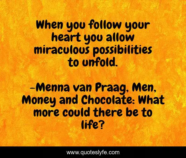 This page presents the quote "When you follow your heart you allow miraculous possibilities to unfold.". Author of this quote is Menna van Praag, Men, Money and Chocolate: What more could there be to life?. This quote is about miracles, heart, destiny, dreams, goals,.