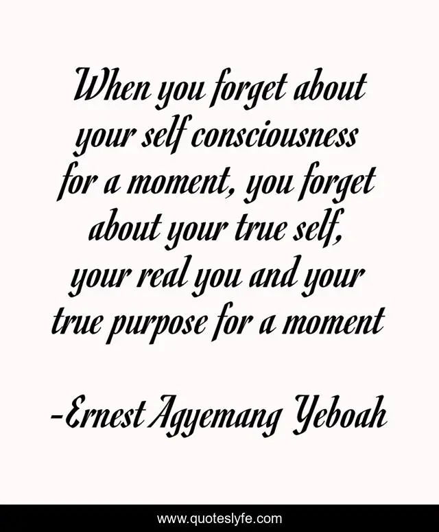 This page presents the quote "When you forget about your self consciousness for a moment, you forget about your true self, your real you and your true purpose for a moment". Author of this quote is Ernest Agyemang Yeboah. This quote is about life, self-confidence, staying-assertive, thought, true-self, self-consciousness, self-awareness, true-purpose,.