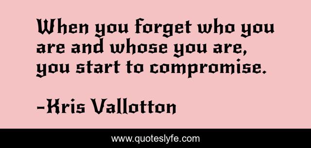 This page presents the quote "When you forget who you are and whose you are, you start to compromise.". Author of this quote is Kris Vallotton. This quote is about god-loves-you, bethel-music, god, value, bethel-church, compromise, purpose, kris-vallotton, worth,.