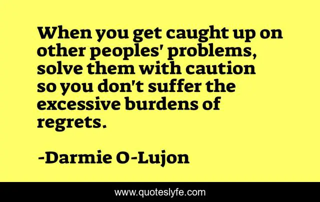 This page presents the quote "When you get caught up on other peoples' problems, solve them with caution so you don't suffer the excessive burdens of regrets.". Author of this quote is Darmie O-Lujon. This quote is about empathy, regrets, sentiment,.