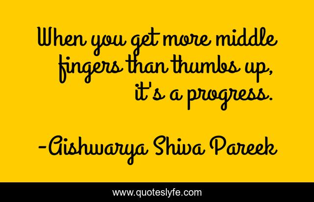 This page presents the quote "When you get more middle fingers than thumbs up, it's a progress.". Author of this quote is Aishwarya Shiva Pareek. This quote is about motivation, positive, motivational, confidence, optimistic, inspirational, enthusiasm, badass,.