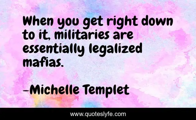 This page presents the quote "When you get right down to it, militaries are essentially legalized mafias.". Author of this quote is Michelle Templet. This quote is about military, war, pacifism,.