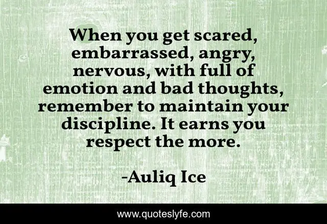 This page presents the quote "When you get scared, embarrassed, angry, nervous, with full of emotion and bad thoughts, remember to maintain your discipline. It earns you respect the more.". Author of this quote is Auliq Ice. This quote is about behavioral-psychology, em, displine, behavior,.