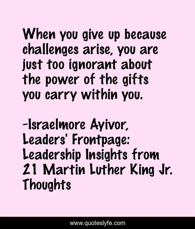 This page presents the quote "When you give up because challenges arise, you are just too ignorant about the power of the gifts you carry within you.". Author of this quote is Israelmore Ayivor, Leaders' Frontpage: Leadership Insights from 21 Martin Luther King Jr. Thoughts. This quote is about challenges, food-for-thought, martin-luther, leaders, gift, arise, israelmore-ayivor, ignorance, gifts,.