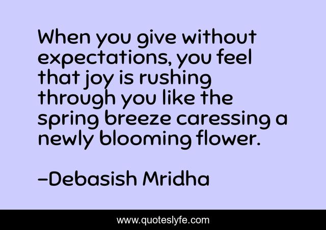 This page presents the quote "When you give without expectations, you feel that joy is rushing through you like the spring breeze caressing a newly blooming flower.". Author of this quote is Debasish Mridha. This quote is about give-without-expectations, joy, philosophy, debasish-mridha, quotes, inspirational, spring-breeze, enthusiasm, debasish-mridha-m-d,.
