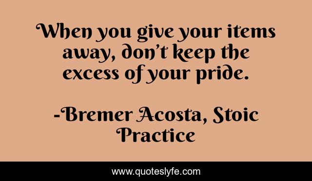 This page presents the quote "When you give your items away, don’t keep the excess of your pride.". Author of this quote is Bremer Acosta, Stoic Practice. This quote is about minimalist, simplicity, simple, stoicism, stoic, minimalism,.