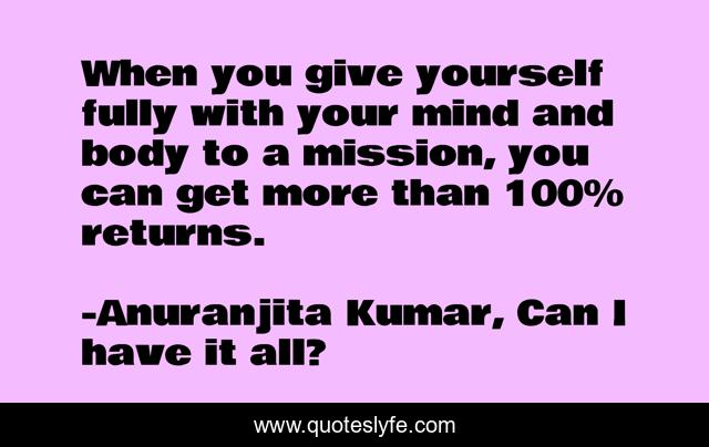 This page presents the quote "When you give yourself fully with your mind and body to a mission, you can get more than 100% returns.". Author of this quote is Anuranjita Kumar, Can I have it all?. This quote is about mind, mission,.