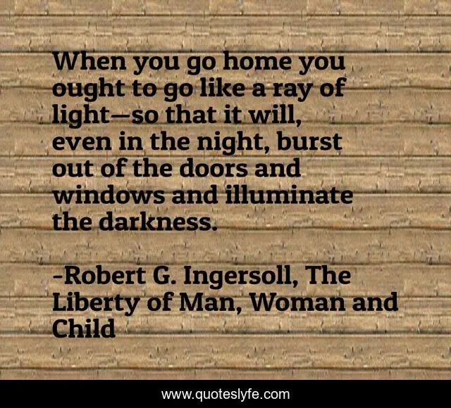 This page presents the quote "When you go home you ought to go like a ray of light—so that it will, even in the night, burst out of the doors and windows and illuminate the darkness.". Author of this quote is Robert G. Ingersoll, The Liberty of Man, Woman and Child. This quote is about light, darkness,.