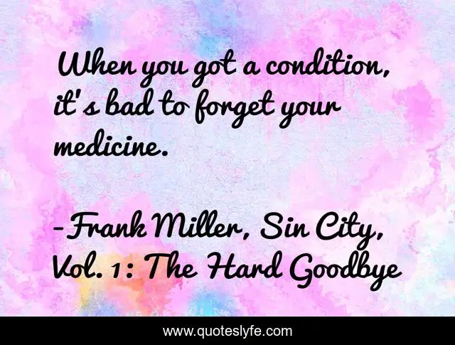 This page presents the quote "When you got a condition, it's bad to forget your medicine.". Author of this quote is Frank Miller, Sin City, Vol. 1: The Hard Goodbye. This quote is about medicine, health,.